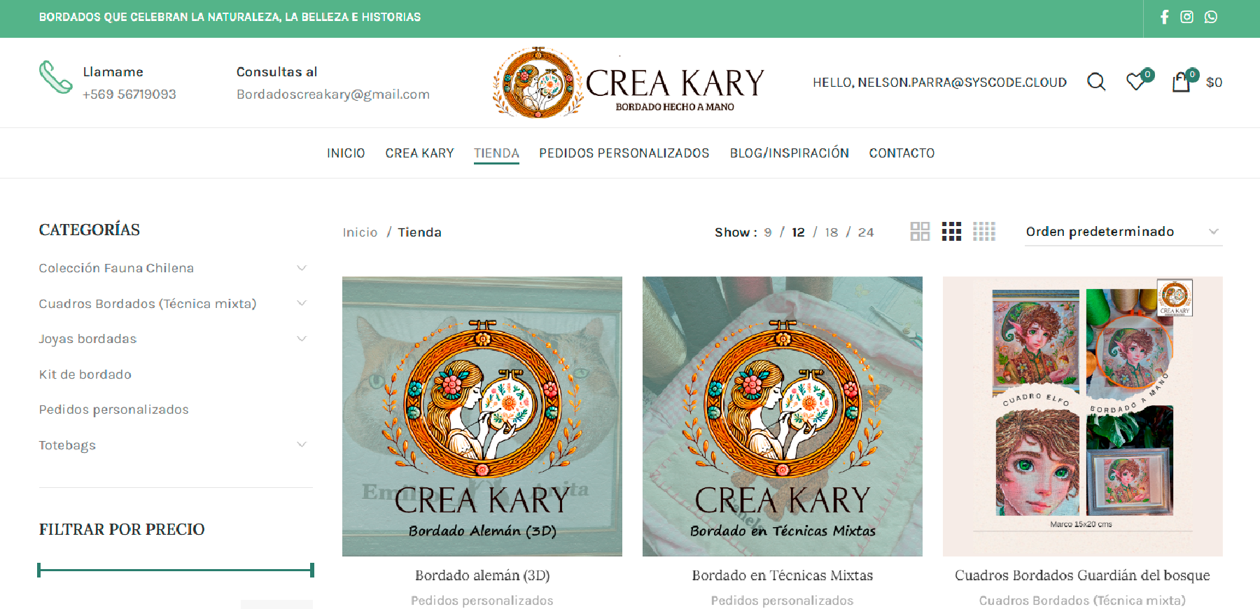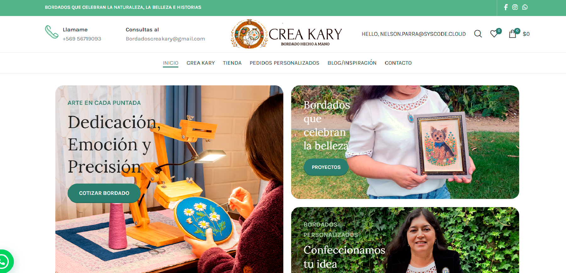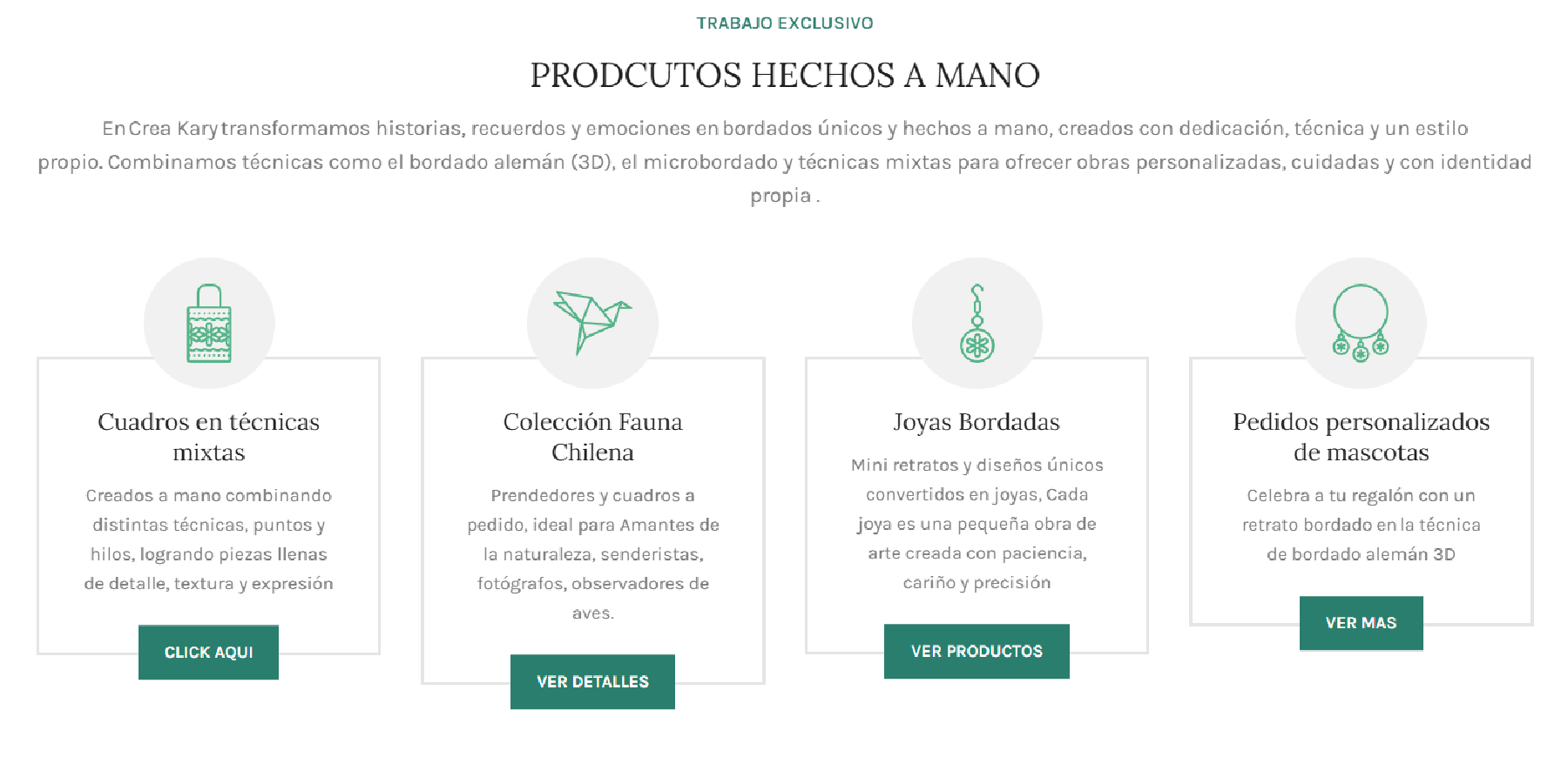 Crea Kary es una tienda online diseñada para destacar la belleza, la historia y el valor artístico de cada pieza bordada. El sitio presenta categorías claras de productos, como cuadros bordados, joyas con microbordado, prendedores y obras personalizadas, que reflejan la originalidad y el trabajo artesanal de la marca.